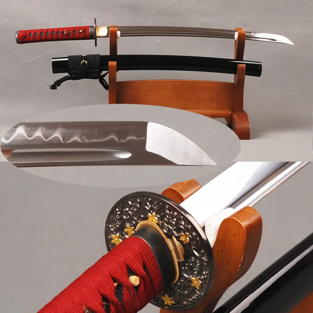 Product Name: Espada samurái japonesa Wakizashi forjada a mano completa Tang T8 arcilla de acero al carbono hoja afilada templada Metal Vintage decoración del hogar
