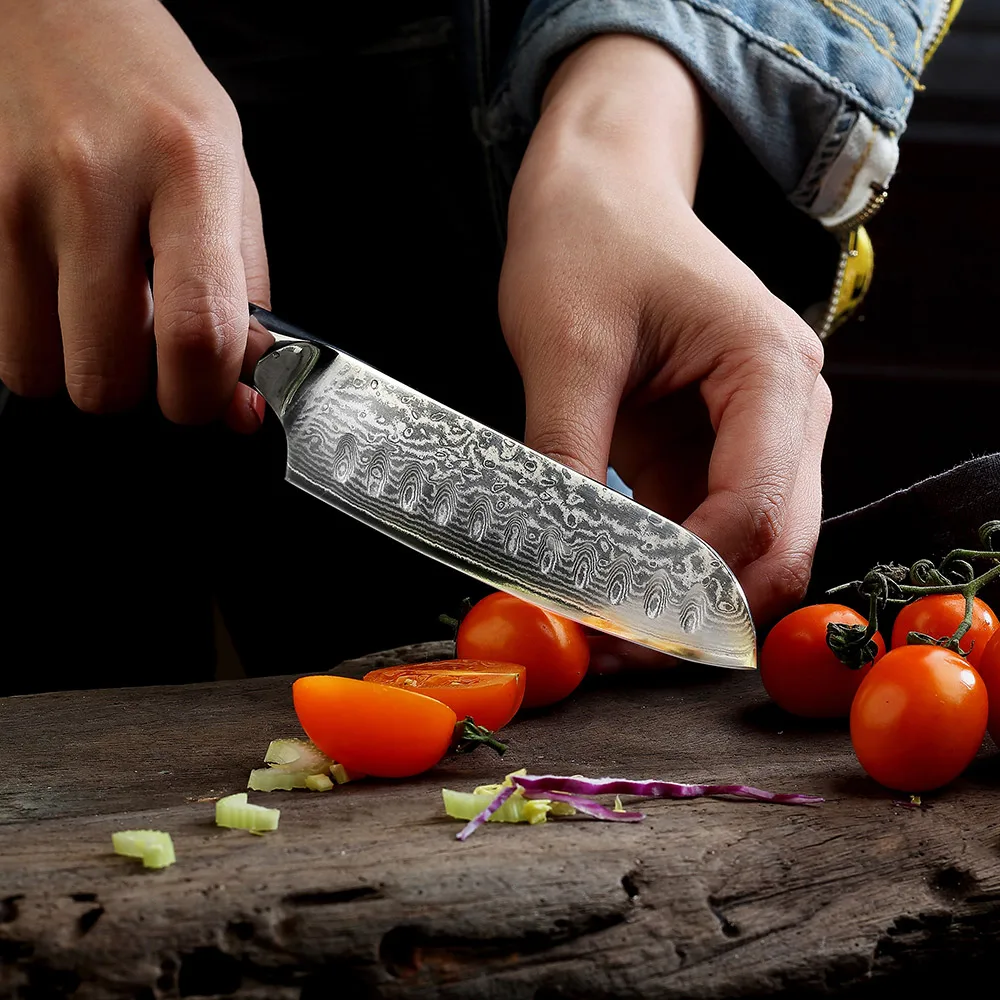 Product Name: Sunnecko 5 \" 7\" Santoku Chef cuchillo de cocina japonés Damasco VG10 acero cuchilla afilada herramientas de corte de carne mango G10