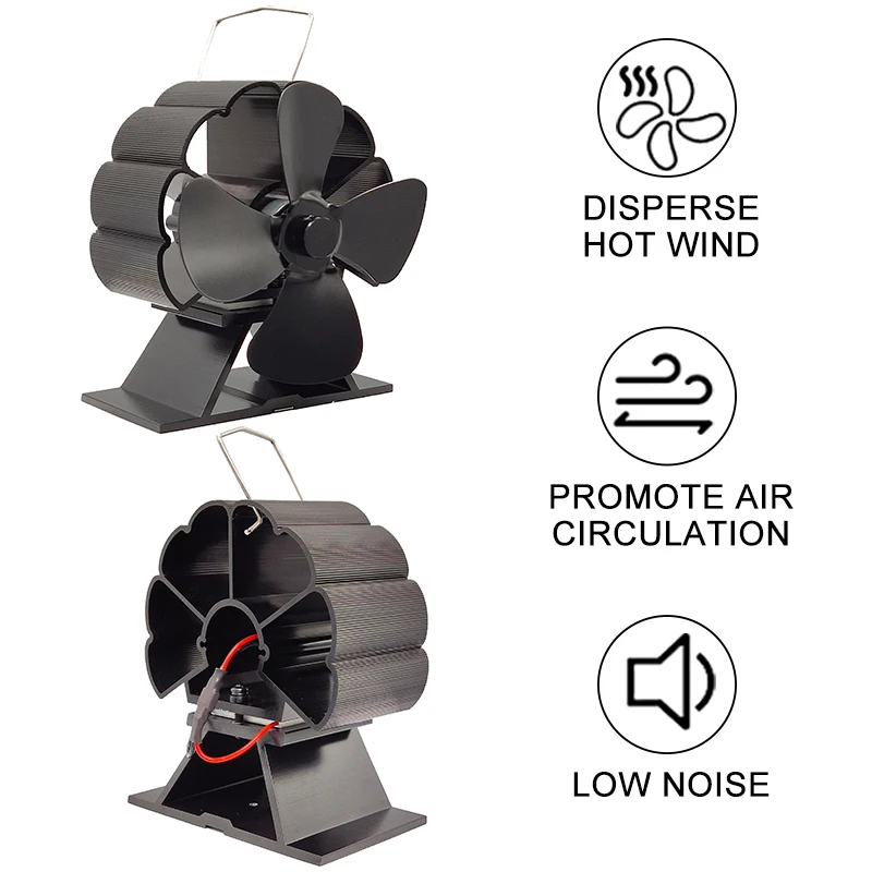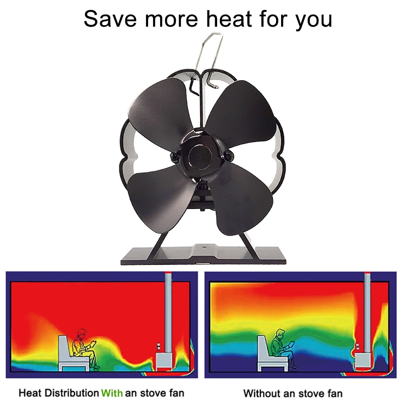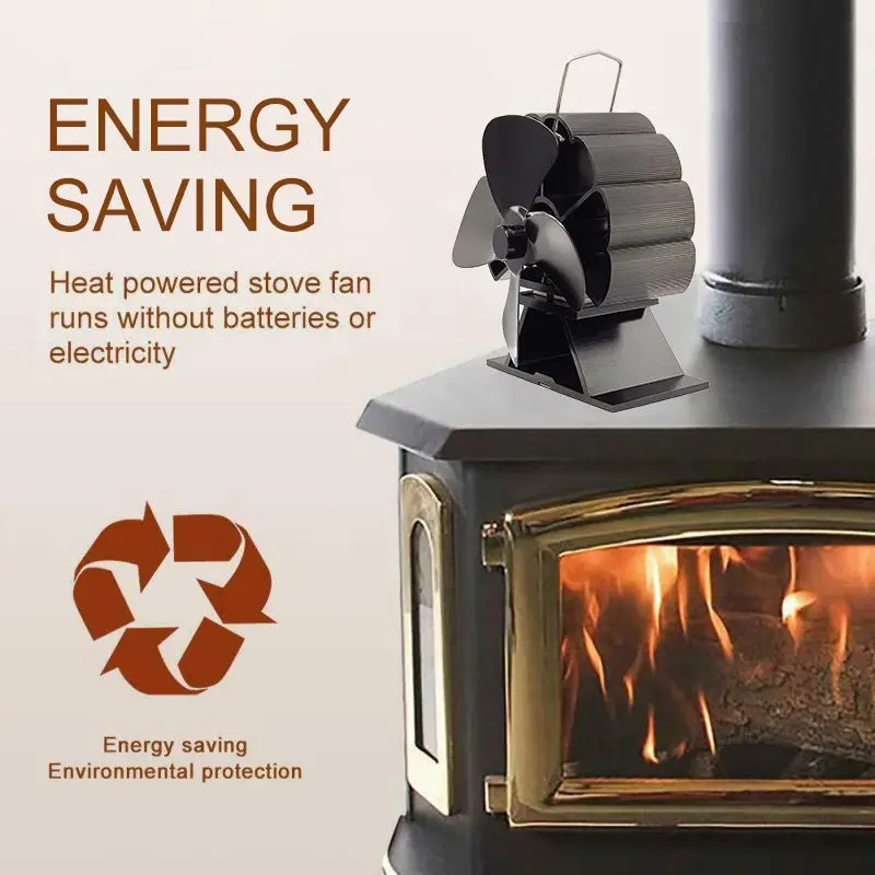 Product Name: Efecient 4 aspas ventilador de estufa de energía térmica registro quemador de madera ecopan silencioso negro hogar Mini ventilador para hogar distribución eficiente del calor