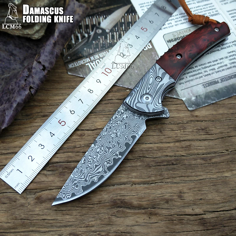 Special Offer LCM66 cuchillo plegable Damasco hecho a mano forjado cuchillo de caza 60vc ébano mango con cuchillo portátil Herramientas afiladas al aire libre knif Discount 15% Today!